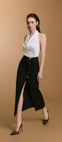 تنورة ضيقة بفتحة أمامية، تتميز بحزام خصر مميز على شكل حرف V وأزرار معدنية أنيقة. مصنوعة من النيوبرين المرن قليلاً، توفر الراحة وقوامًا مثاليًا. يُبرز التصميم قوامكِ بلمسة عصرية، مما يجعلها مثالية للمناسبات الرسمية، واجتماعات العمل، والمناسبات المهنية.