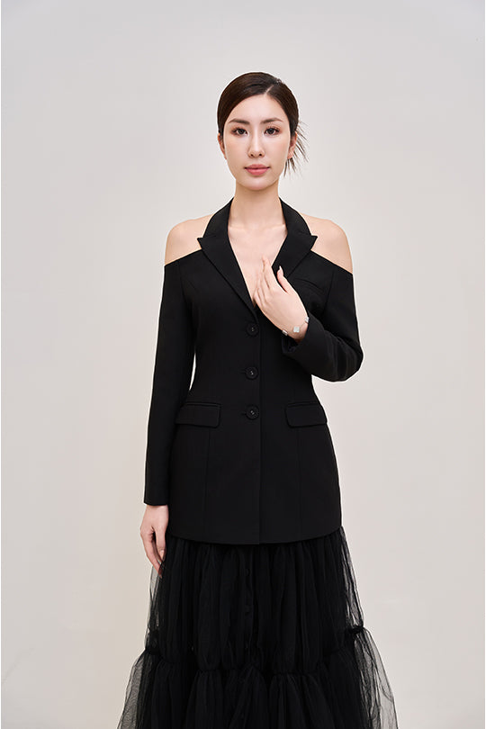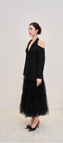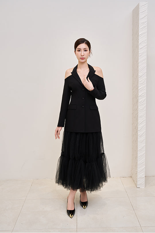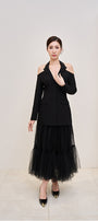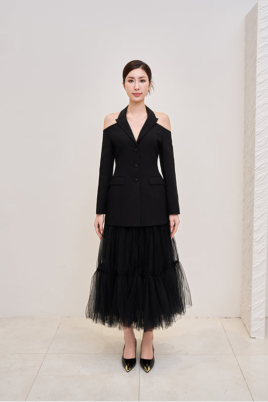 Devil Midi Skirt – Layered tulle midi skirt featuring a front button placket and detachable lining, offering versatile styling and fluid elegance.