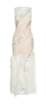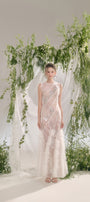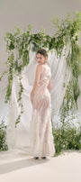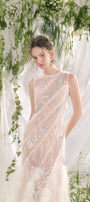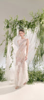 - مصنوعة من ألواح من الدانتيل والشبكة، مع فراشات فضية مطبقة يدويًا تتلألأ بشكل رقيق أسفل الطبقة الشفافة.