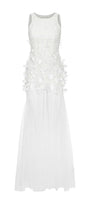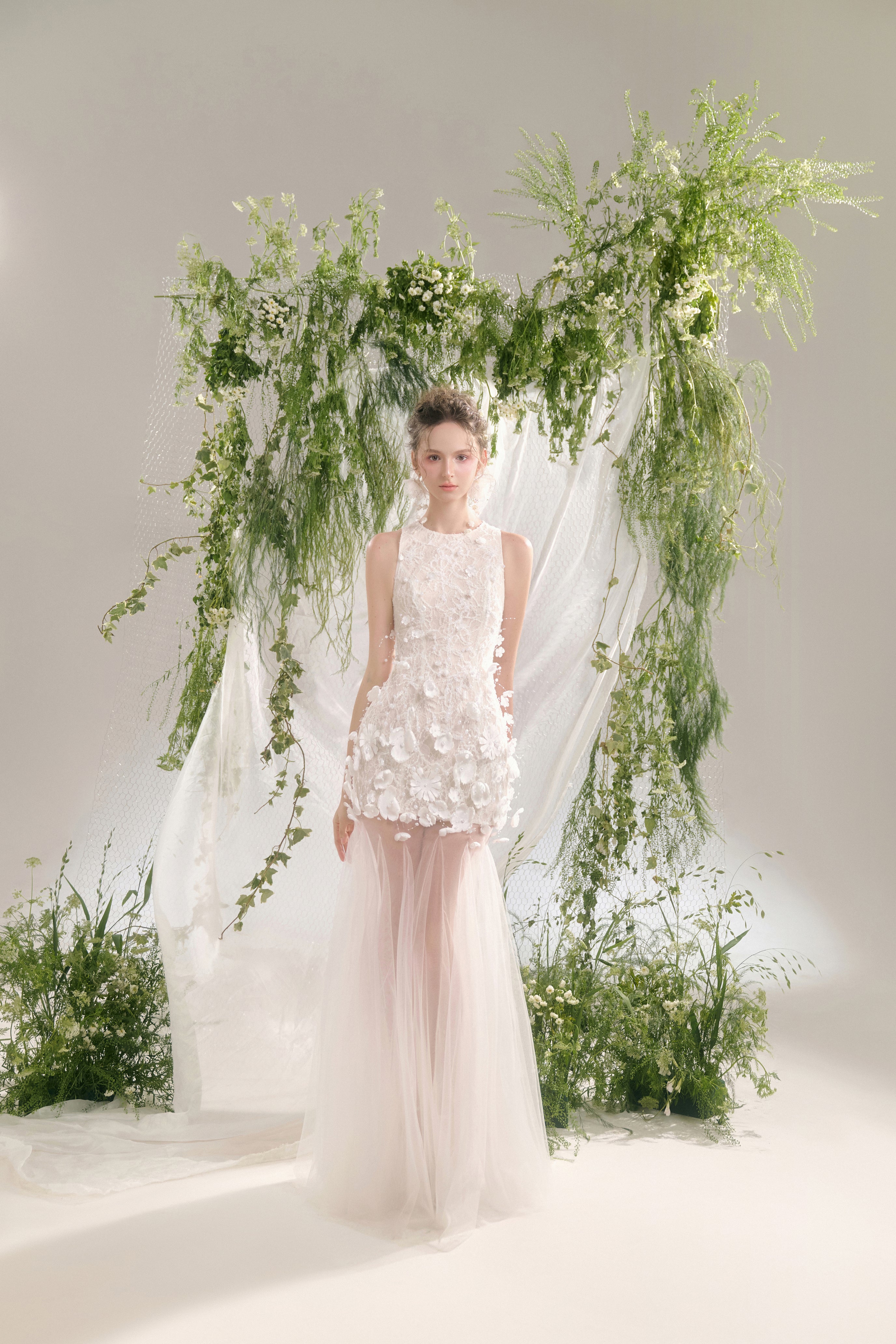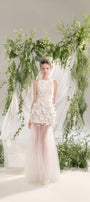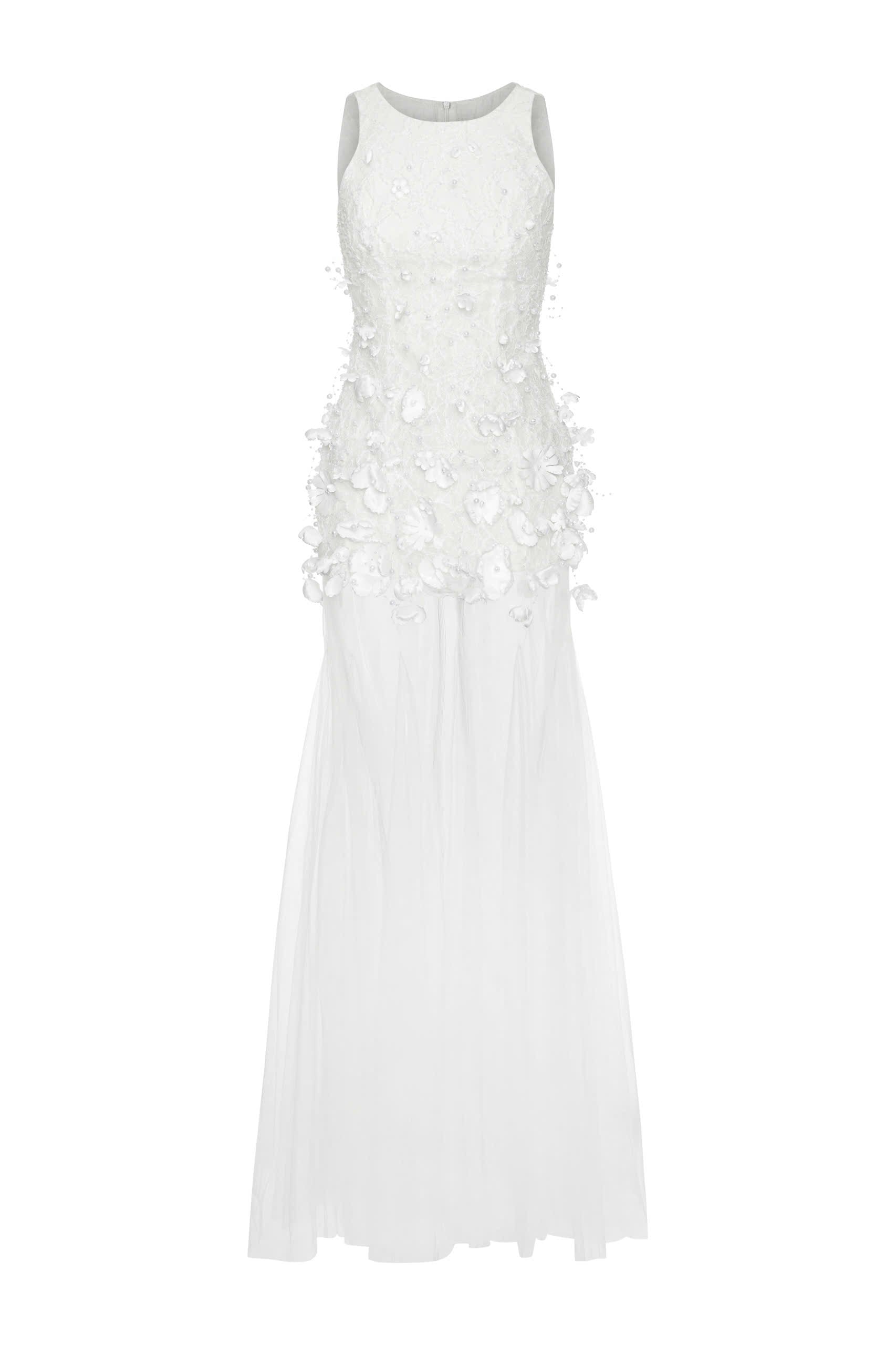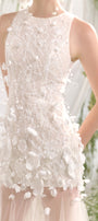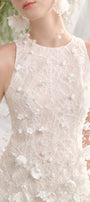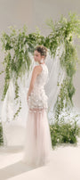 صُنع صدّار هالتر من دانتيل فاخر بنسيج ثلاثي الأبعاد يُضفي عمقًا وأناقة. مُزيّن بمئات الزخارف الزهرية والخرزية المُطبّقة يدويًا، يتألق الجزء العلوي من الفستان برقة ويتأرجح مع كل حركة، مُضفيًا لمسةً من الأناقة الأنثوية.