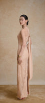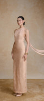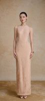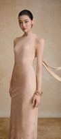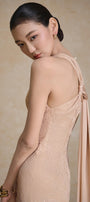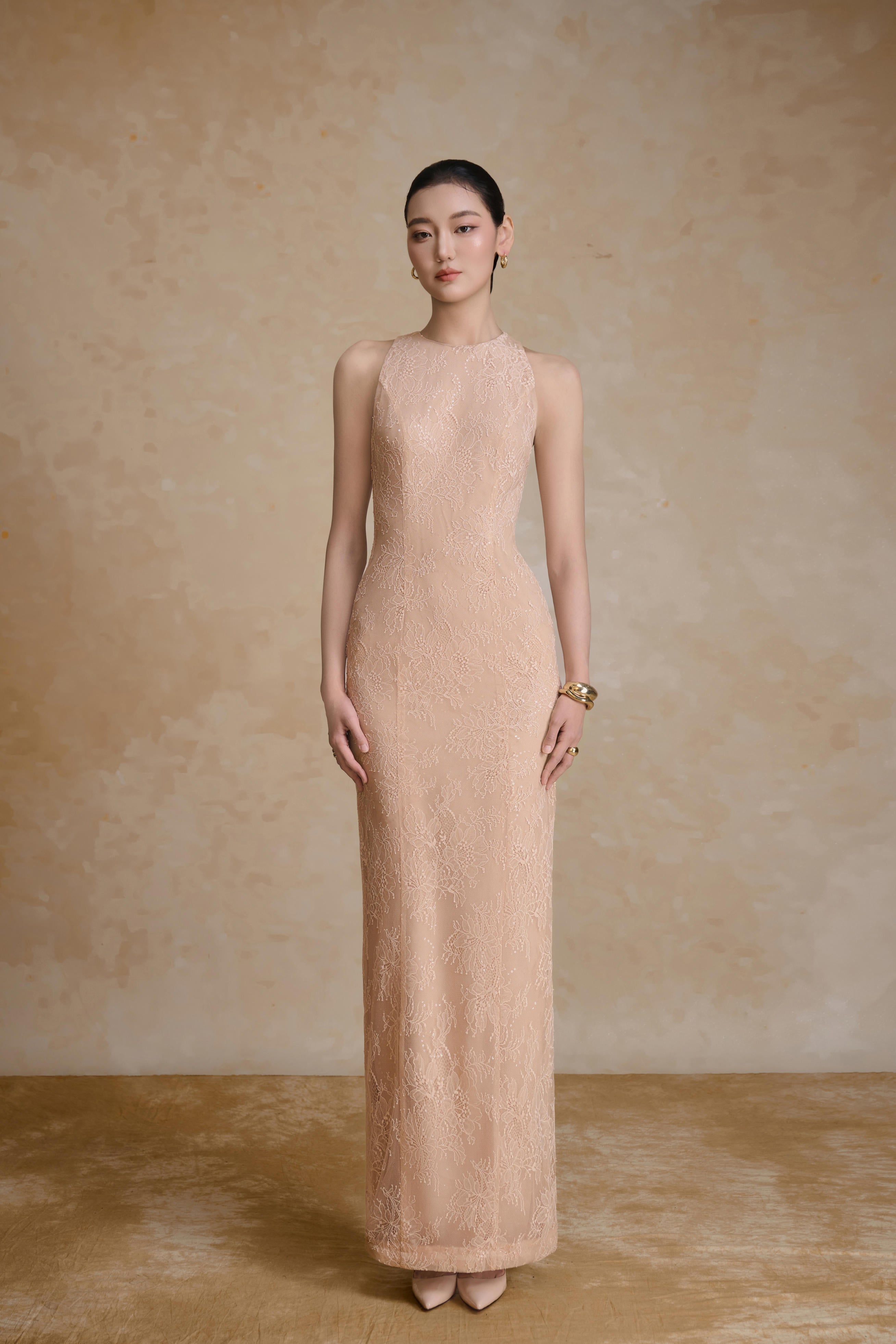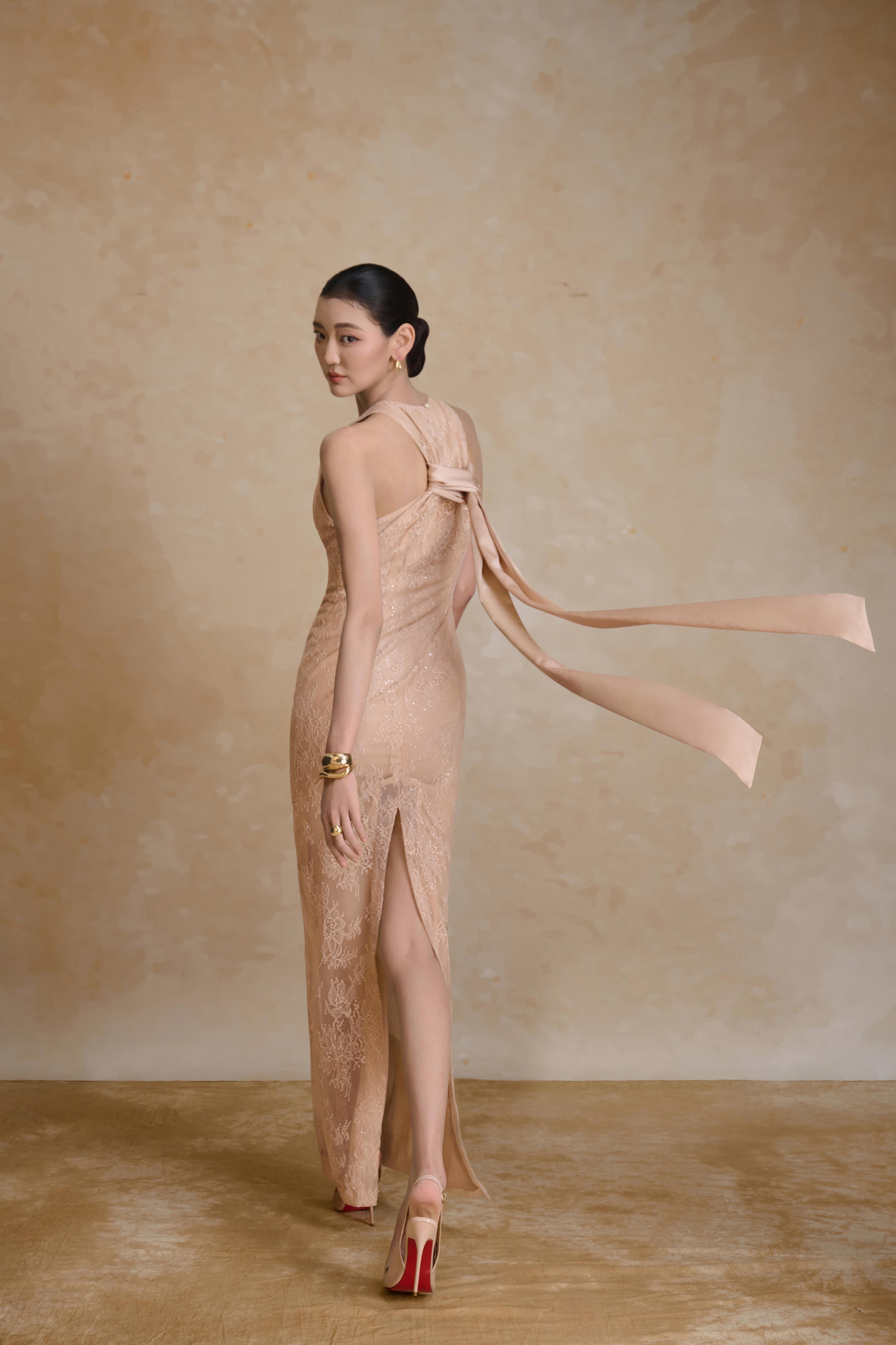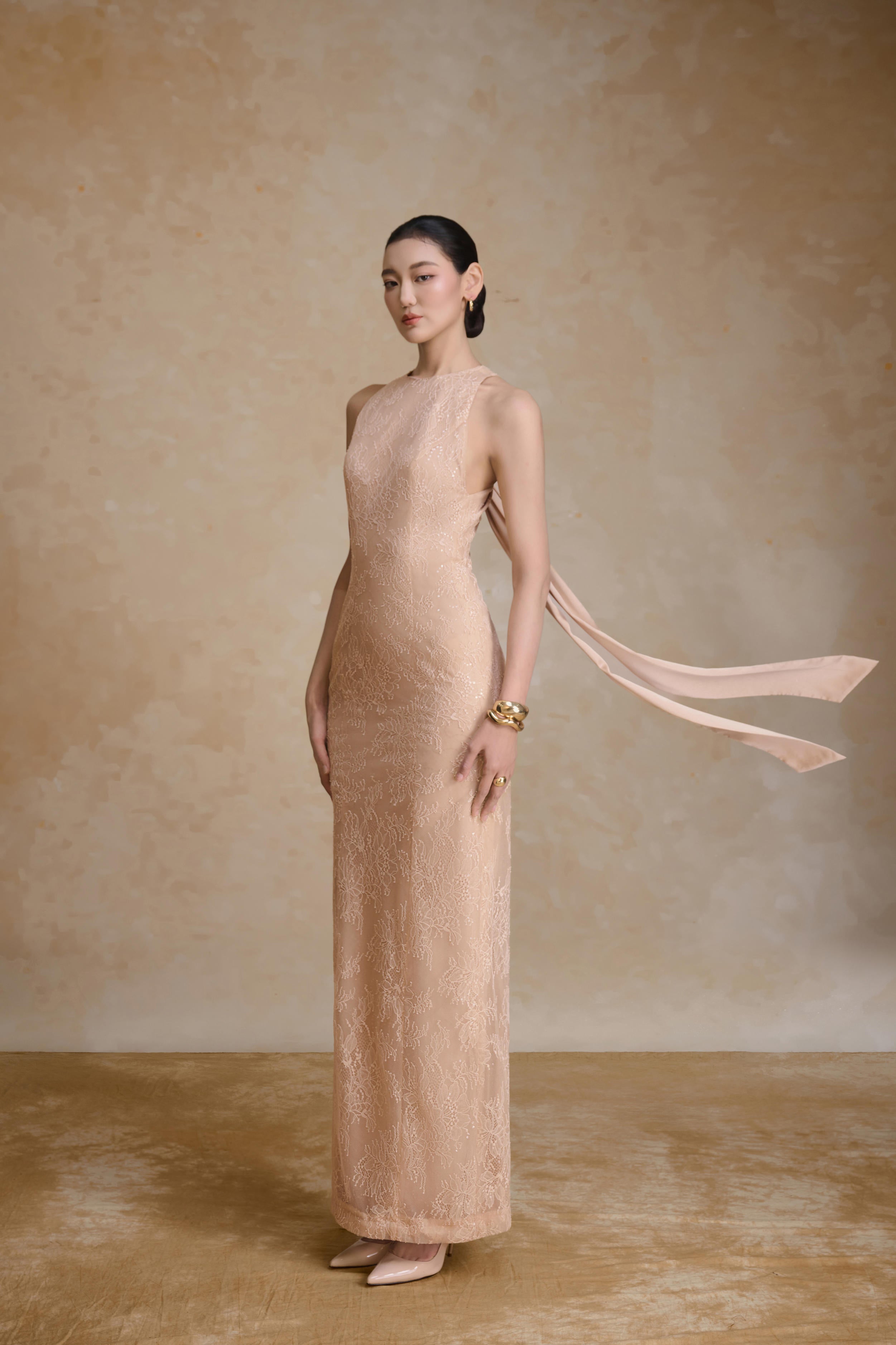 فستان دانتيل ضيق بفتحة رقبة أنيقة، مزين برباط من الحرير من الخلف. بلون وردي فاتح جذاب، ينضح بالأنوثة والرقي والجاذبية.
