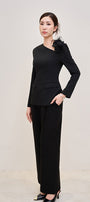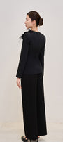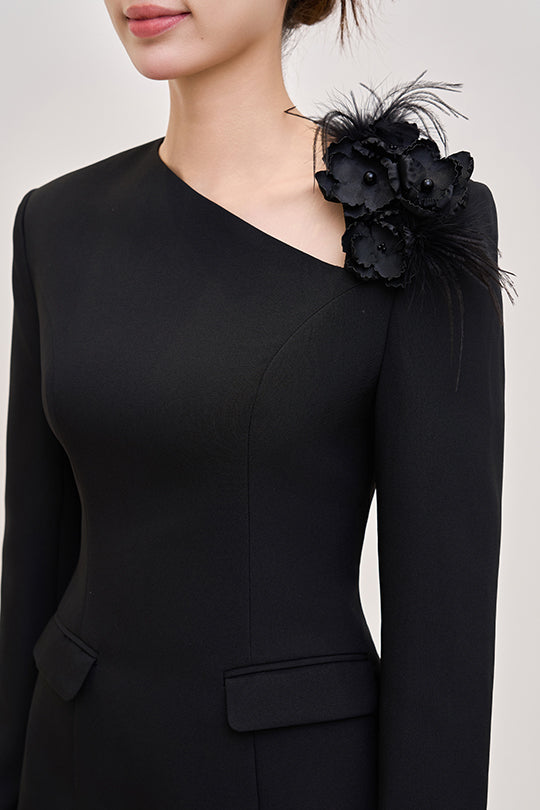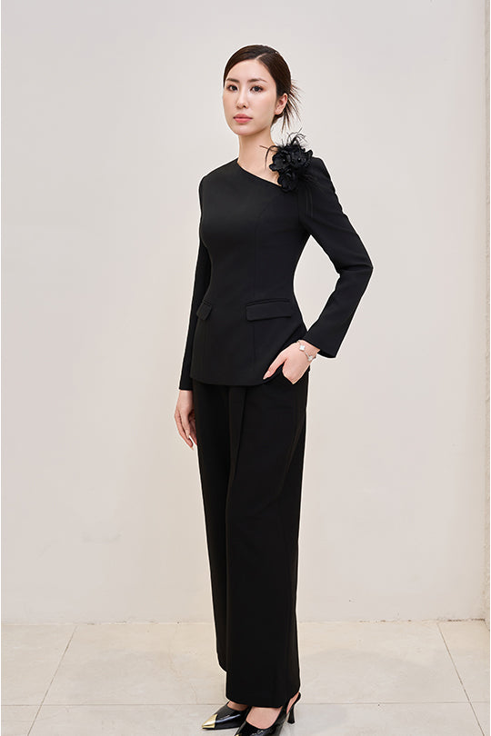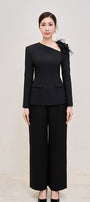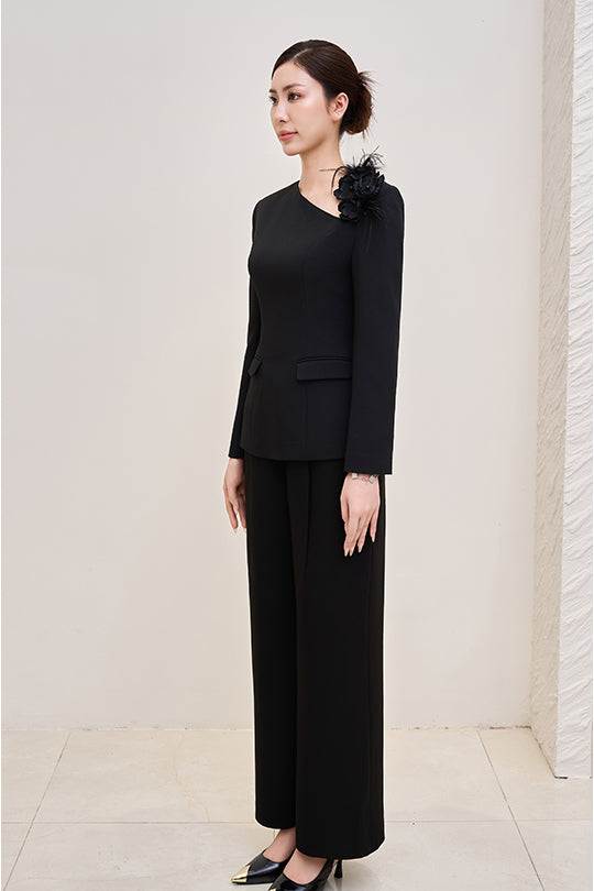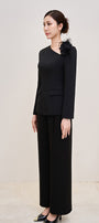 Kim Vest – Asymmetric V-neck blazer lined with silk, featuring a handcrafted floral and feather embellishment at the back for an elegant, couture finish.