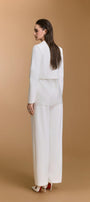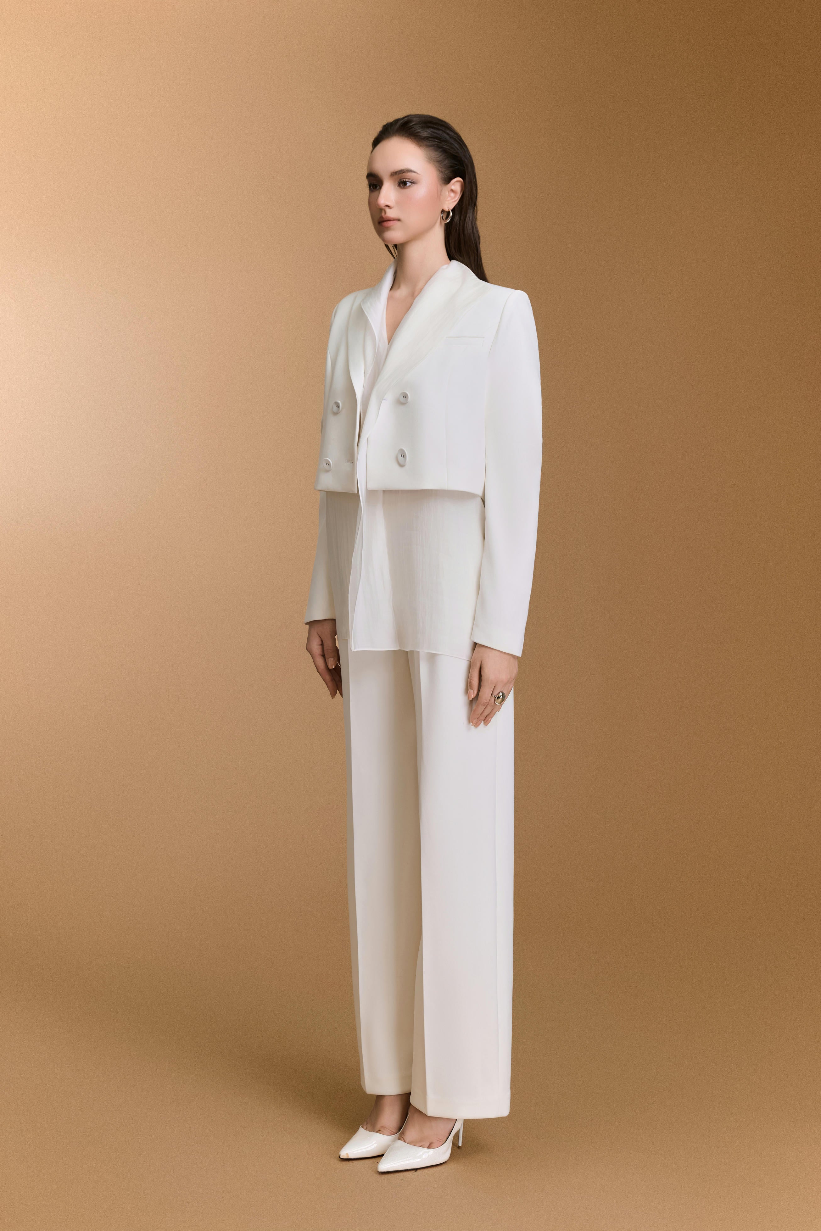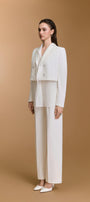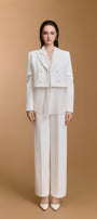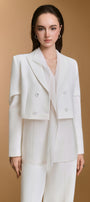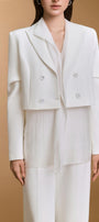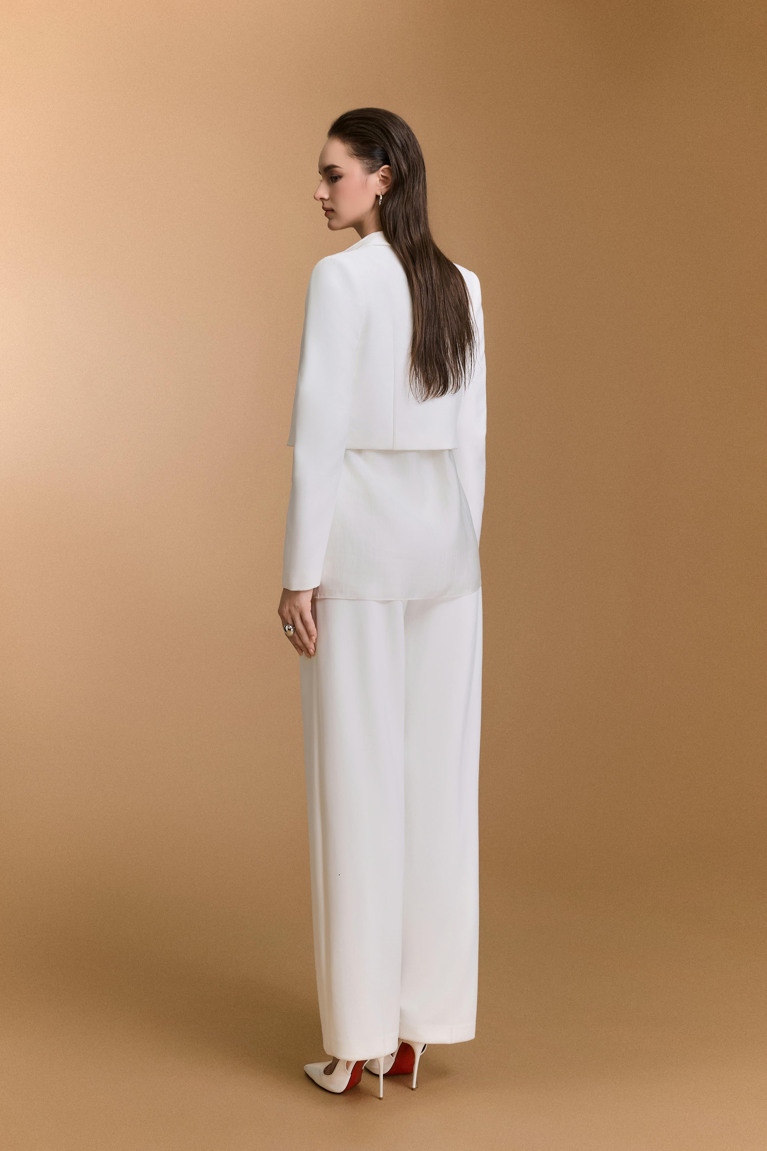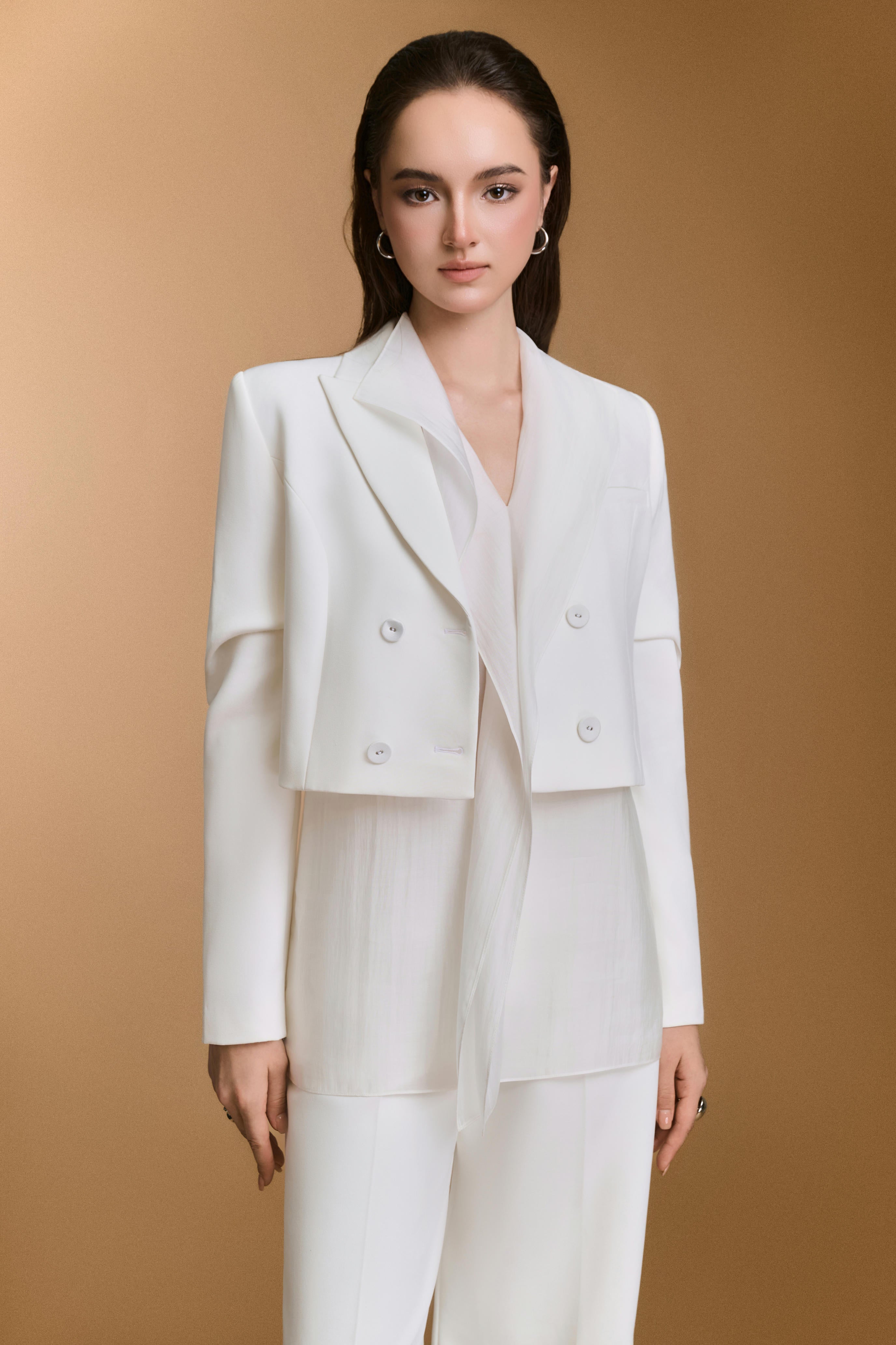 سترة قصيرة تتميز بأكمام منفوخة ناعمة مع تفاصيل مطوية دقيقة وياقة كلاسيكية مدببة.