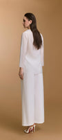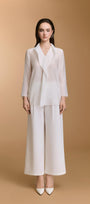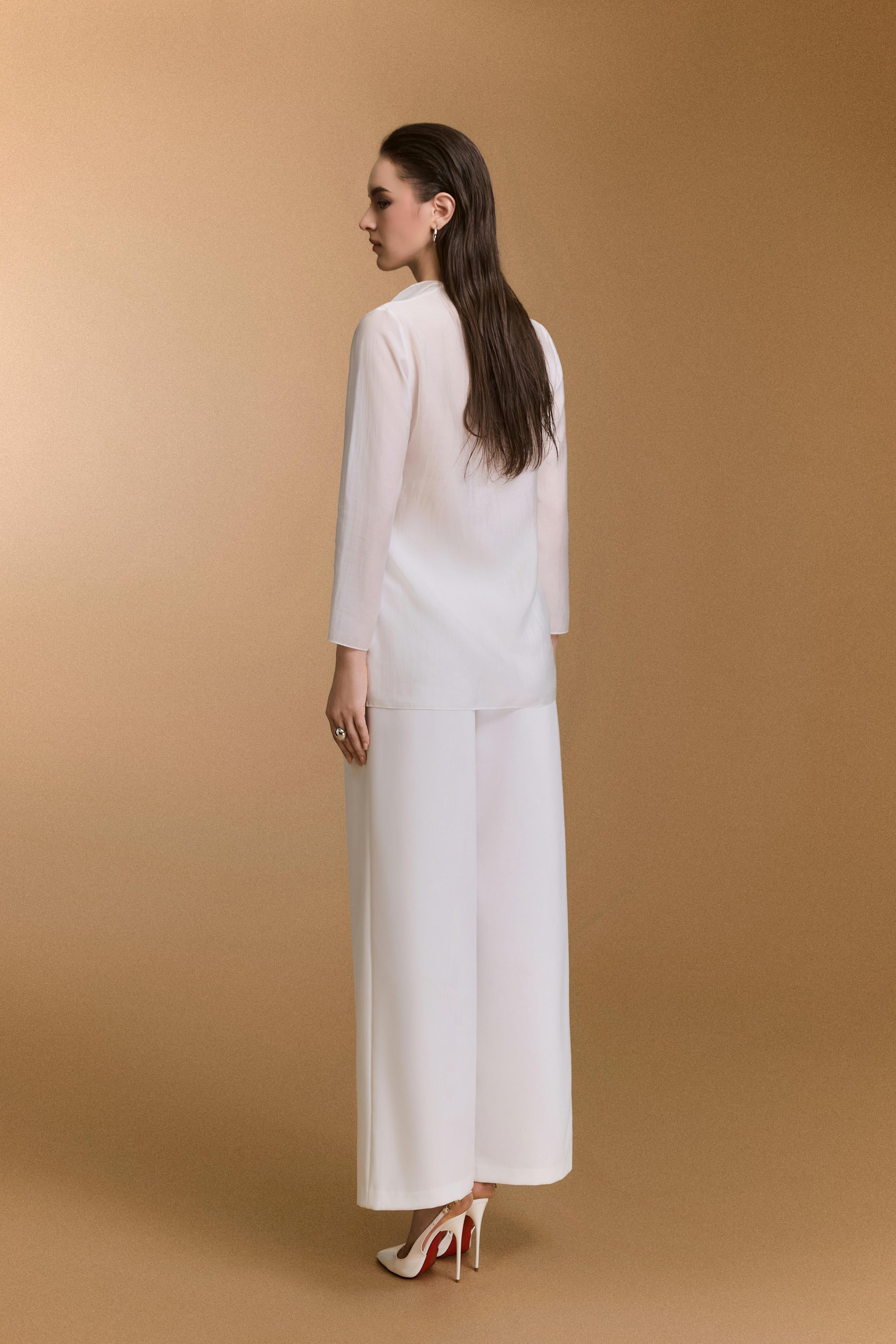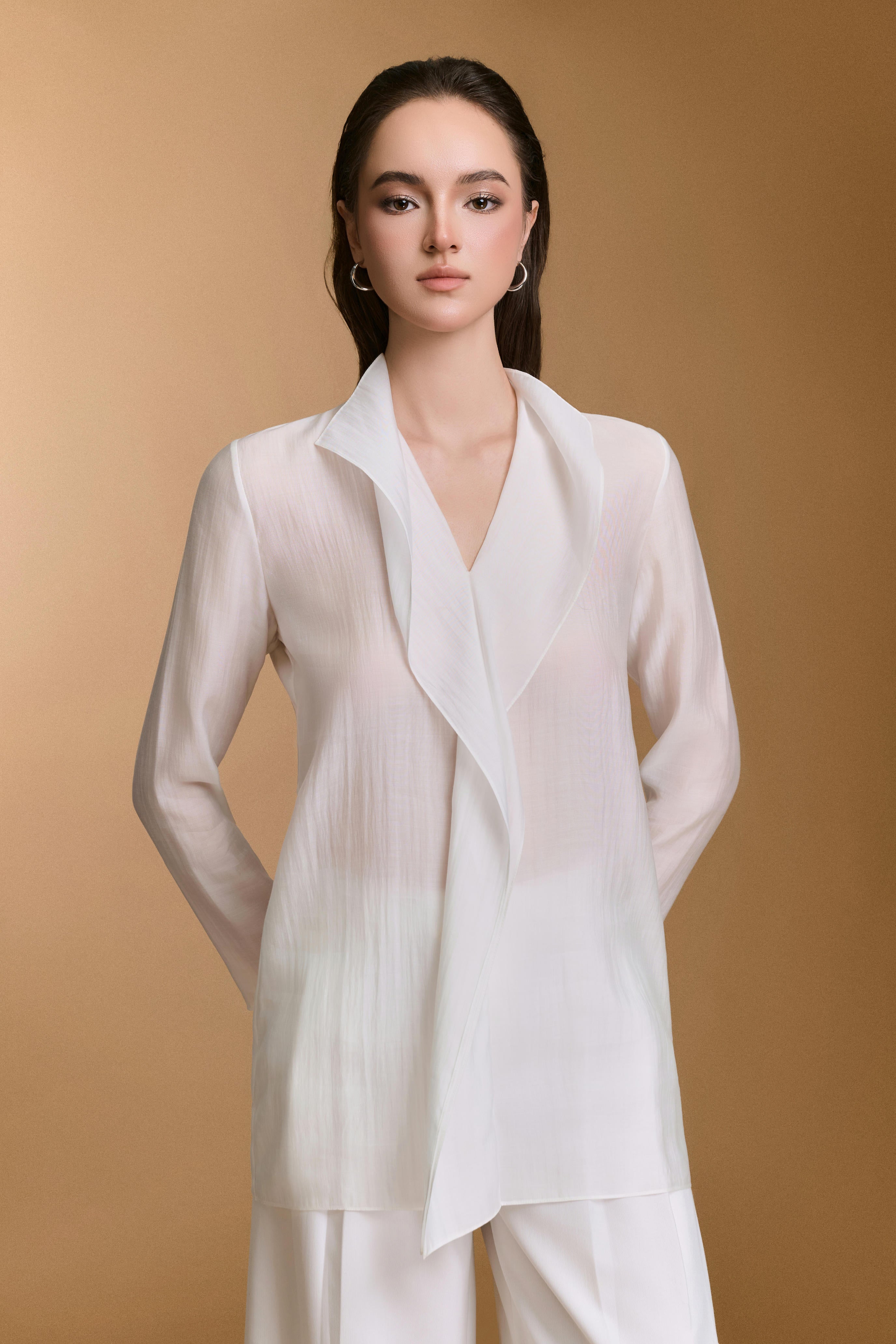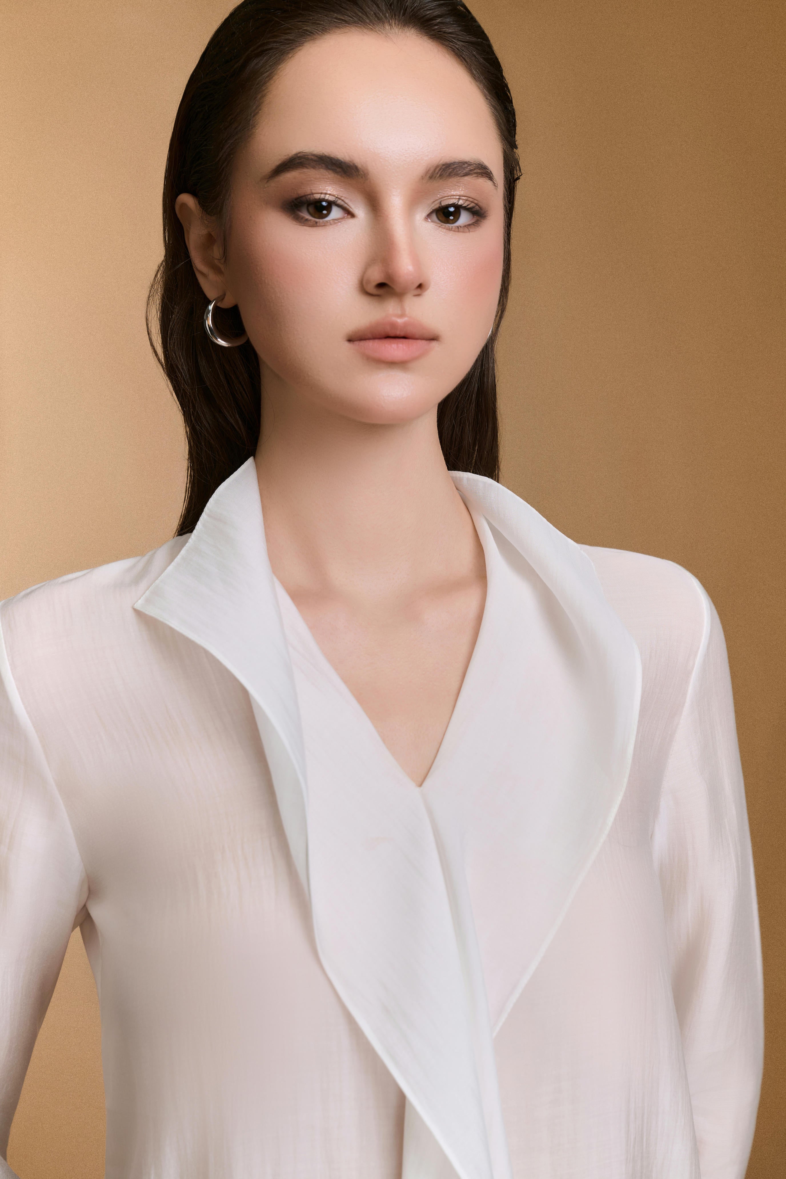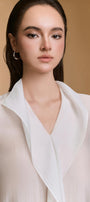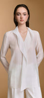 بلوزة مريحة مصنوعة من حرير الخيزران، تتميز بفتحة رقبة عالية مع تفاصيل كشكشة متتالية ناعمة.