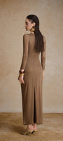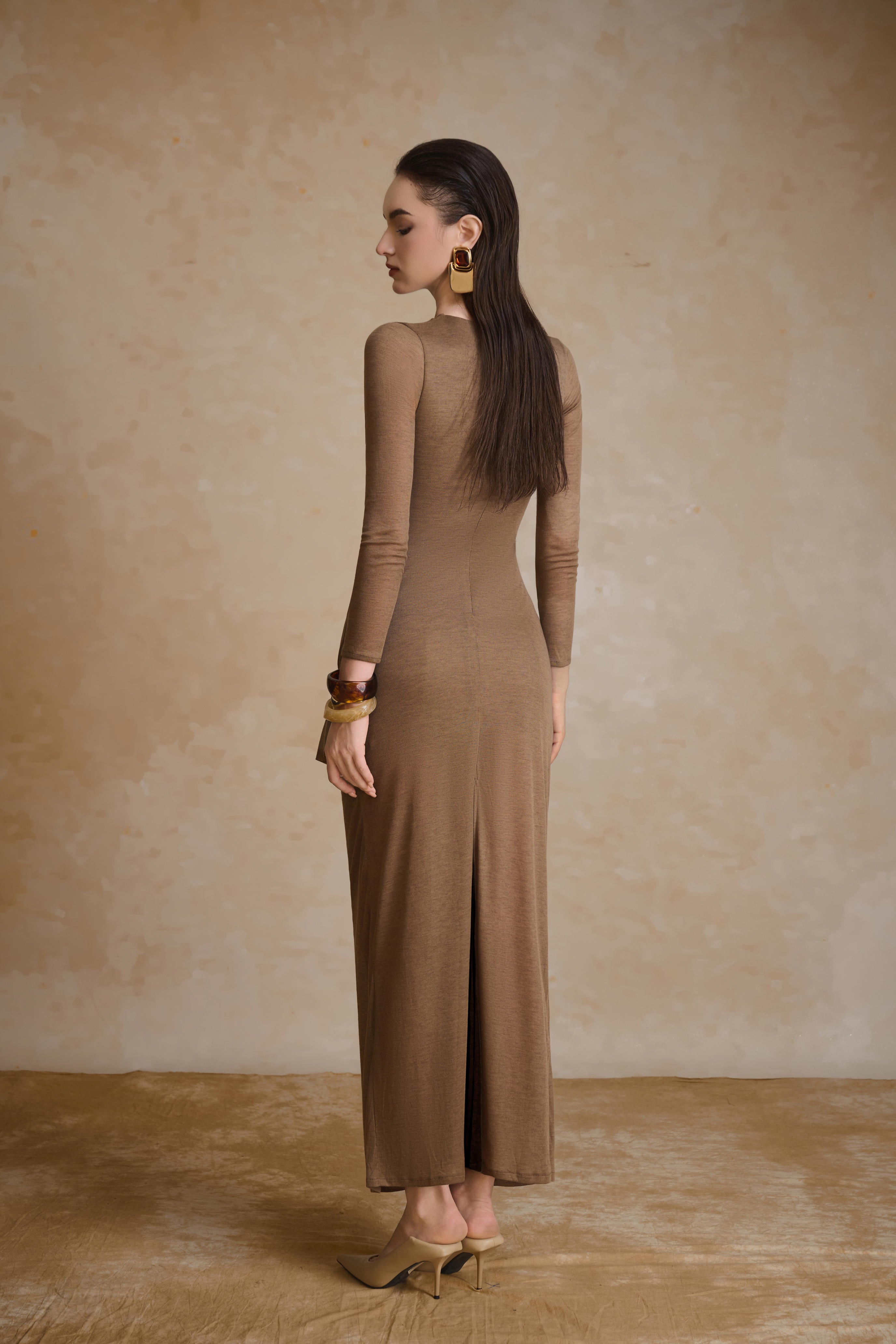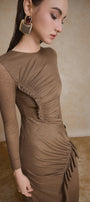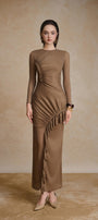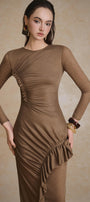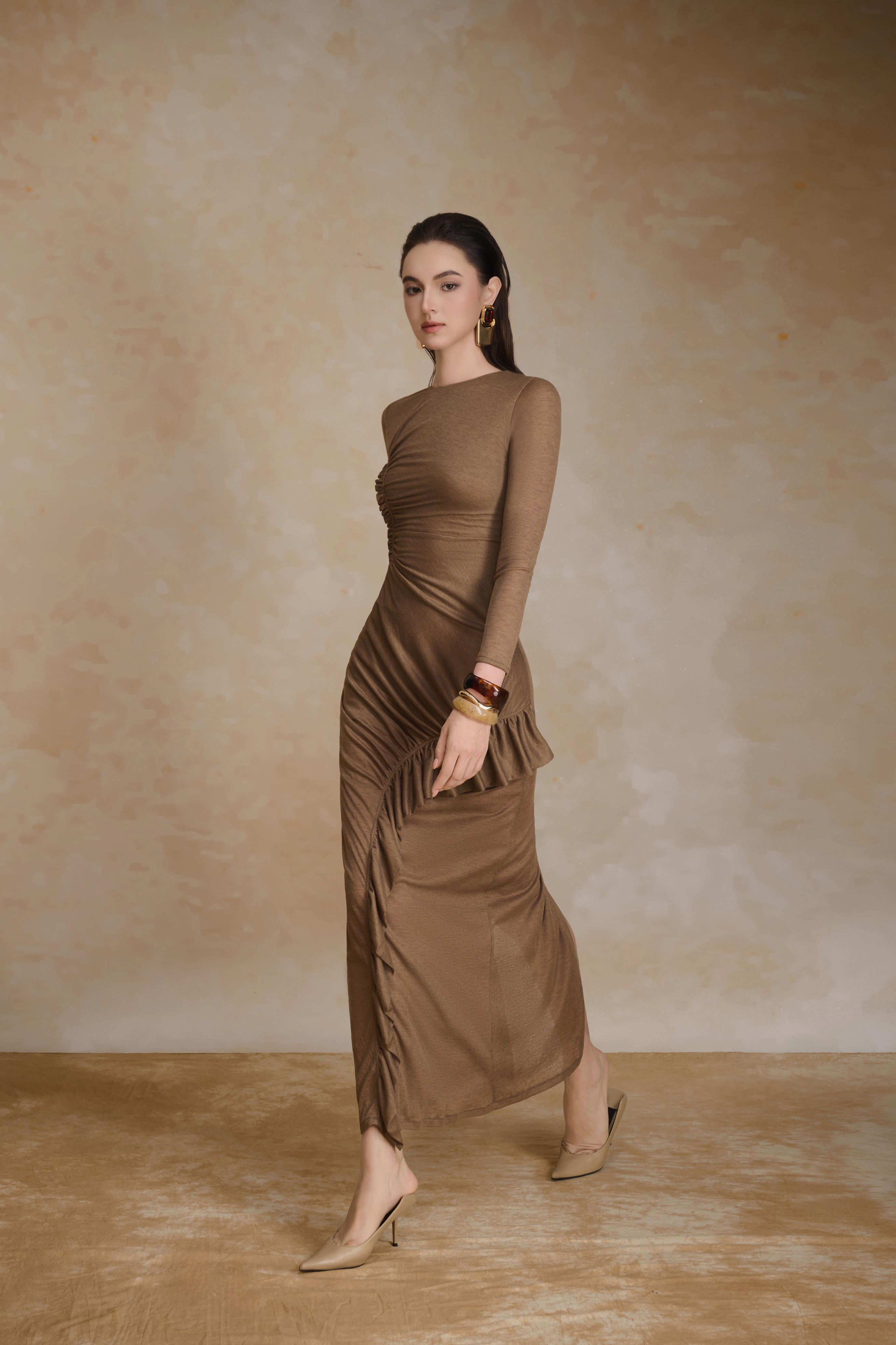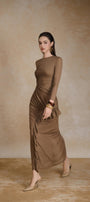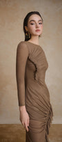 فستان ضيق من قماش الجيرسي الصناعي، بلون الكاكاو الفاتح الأنيق. يتميز بتفاصيل مميزة من الكشكشة المتتالية، ويلعب التصميم ببراعة على الملمس ليمنحه تأثيرًا بصريًا أخاذًا. تُضفي الثنيات المجمعة بعناية لمسة جريئة، مما يضفي عليه لمسة راقية وعصرية.