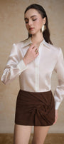 قميص كلاسيكي بتصميم جديد، بياقة مسطحة عصرية، مصنوع من الأورجانزا الفاخرة بلون أبيض بورسلين ناعم ولمسة لؤلؤية رقيقة. تصميمه المهيكل يُضفي لمسة من الرقي والحداثة.