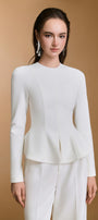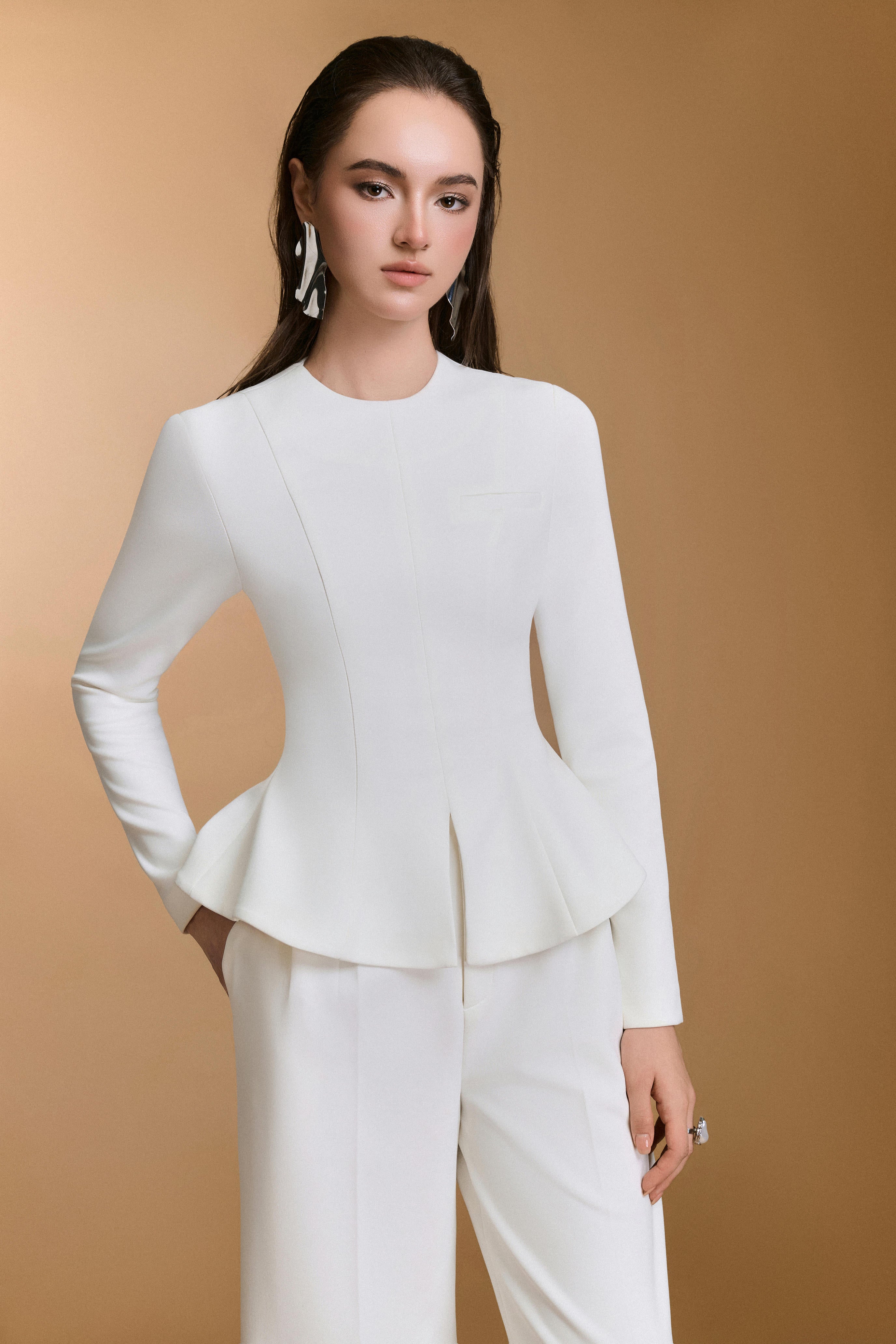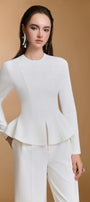 بنطلون مستقيم الساق مع طيات واسعة، مصنوع من مادة النيوبرين المنظمة السميكة والمرنة قليلاً لسهولة الحركة.