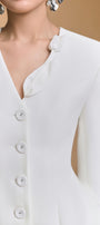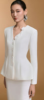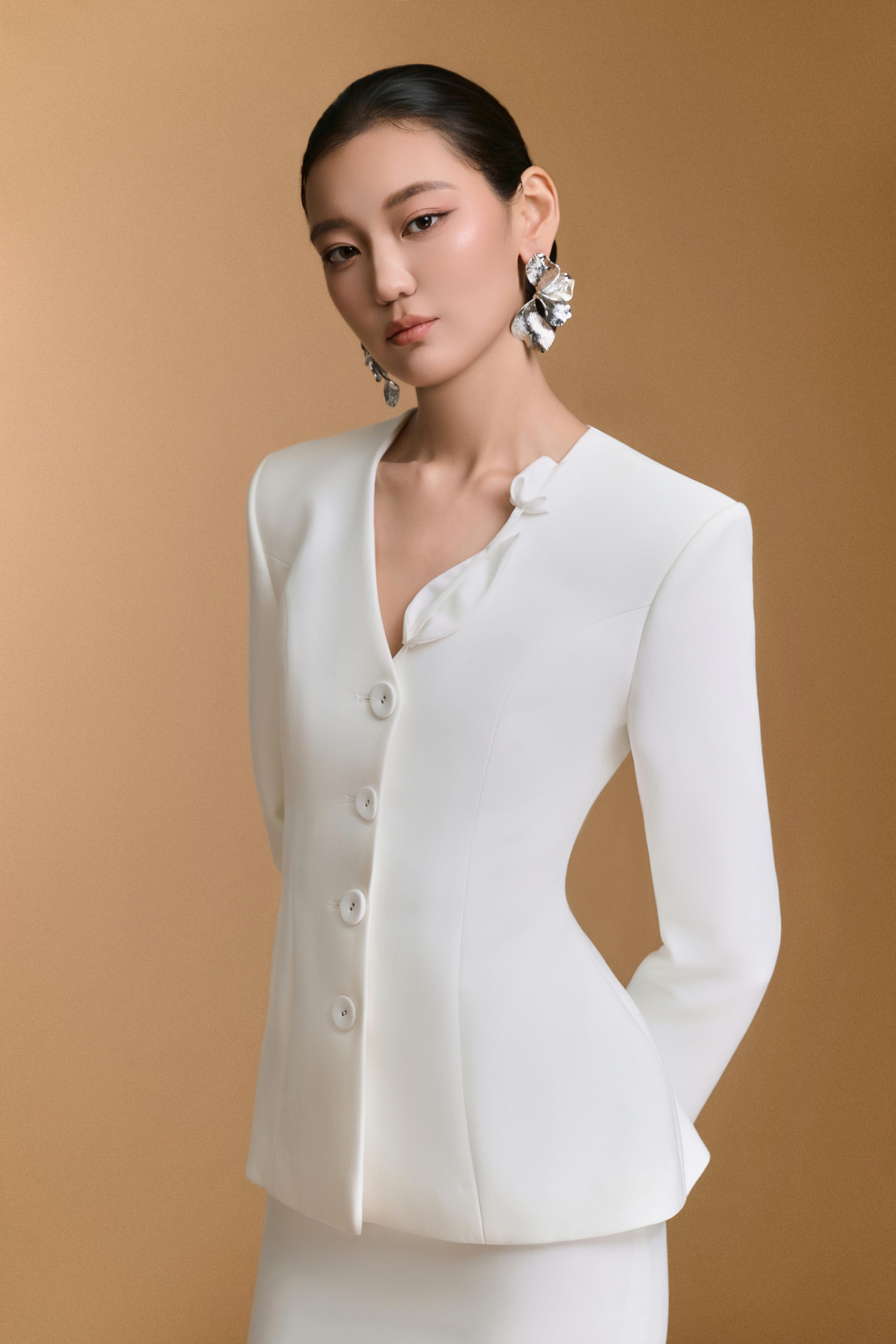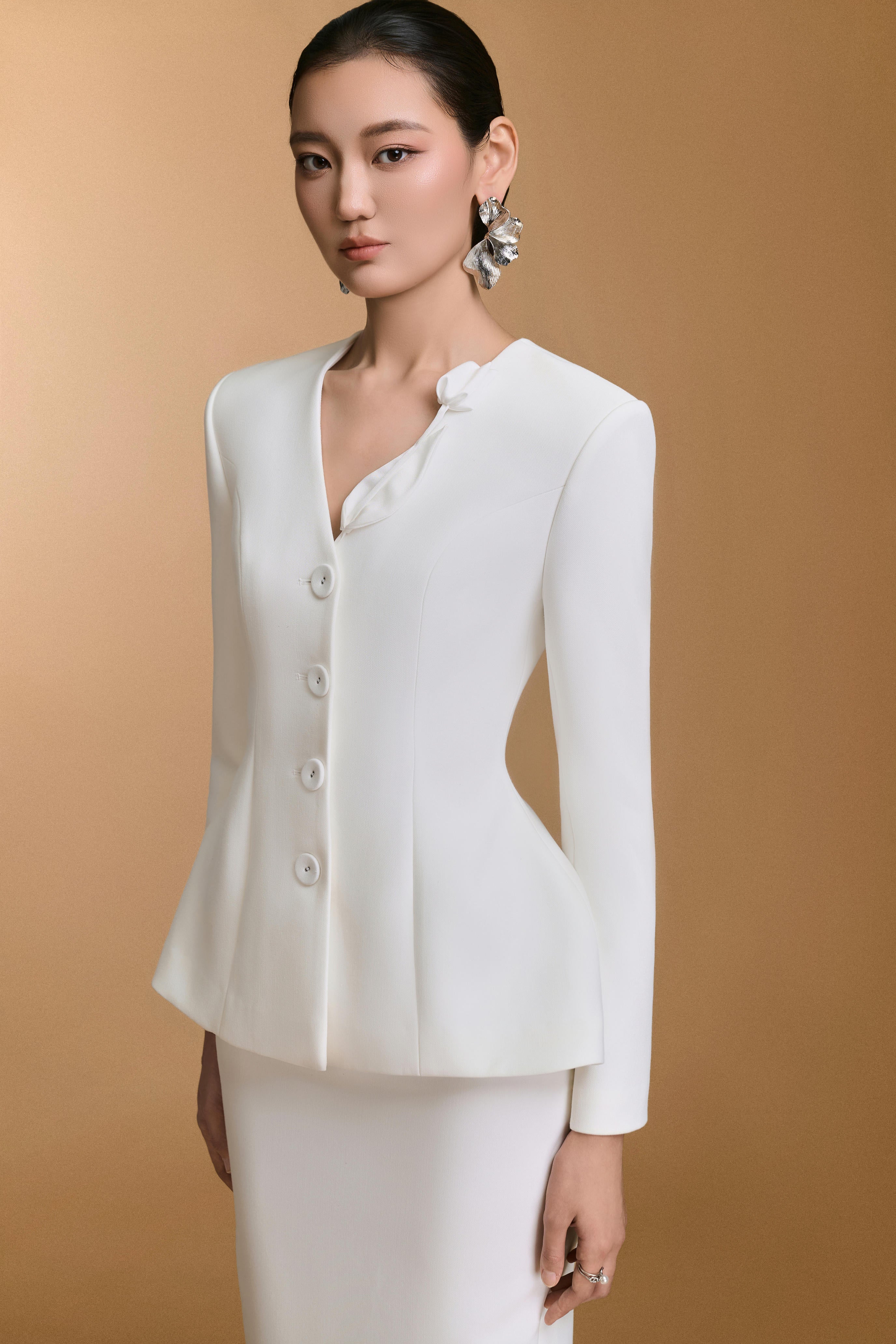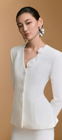 سترة مصممة خصيصًا ذات خصر مشدود مع أرداف متسعة بشكل لطيف للحصول على مظهر ظلي جذاب، مزينة بزخارف توليب حريرية أنيقة ومبطنة بالكامل بالحرير الفاخر.