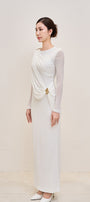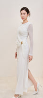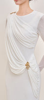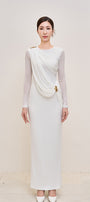 Elegant long jersey dress featuring soft draped details and a refined decorative accent.