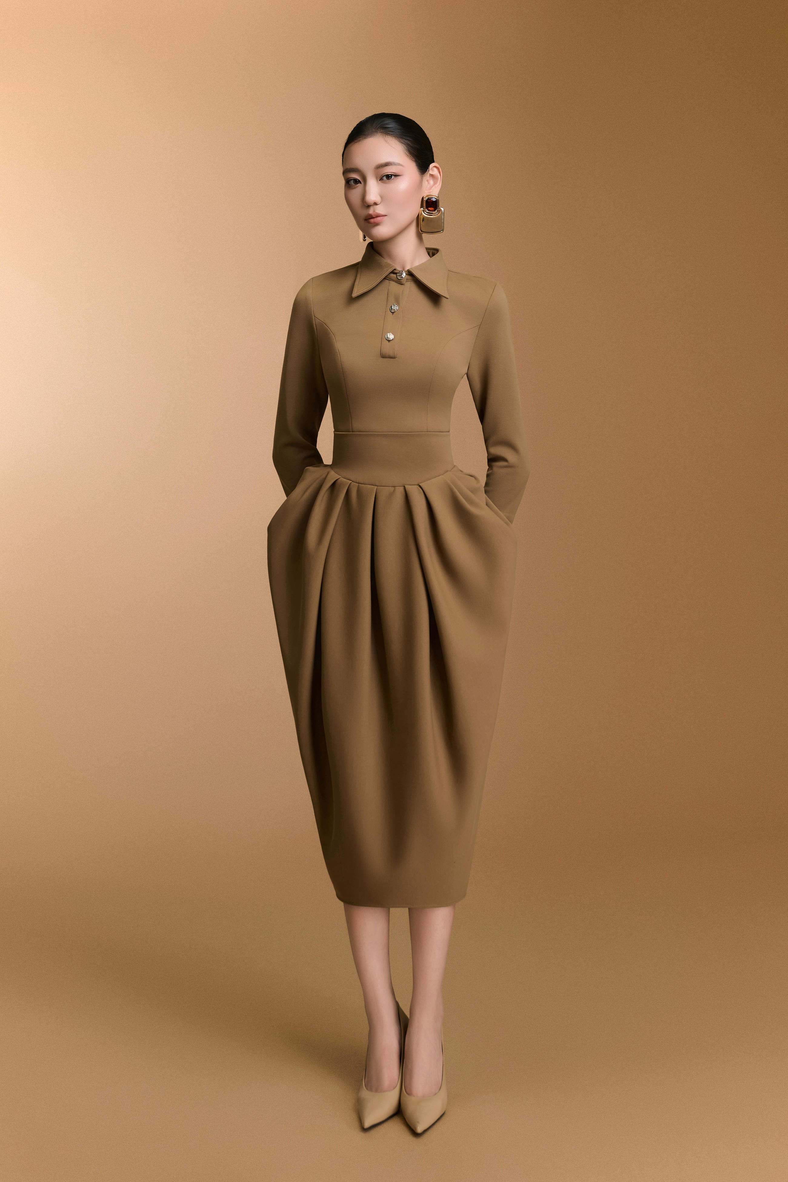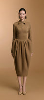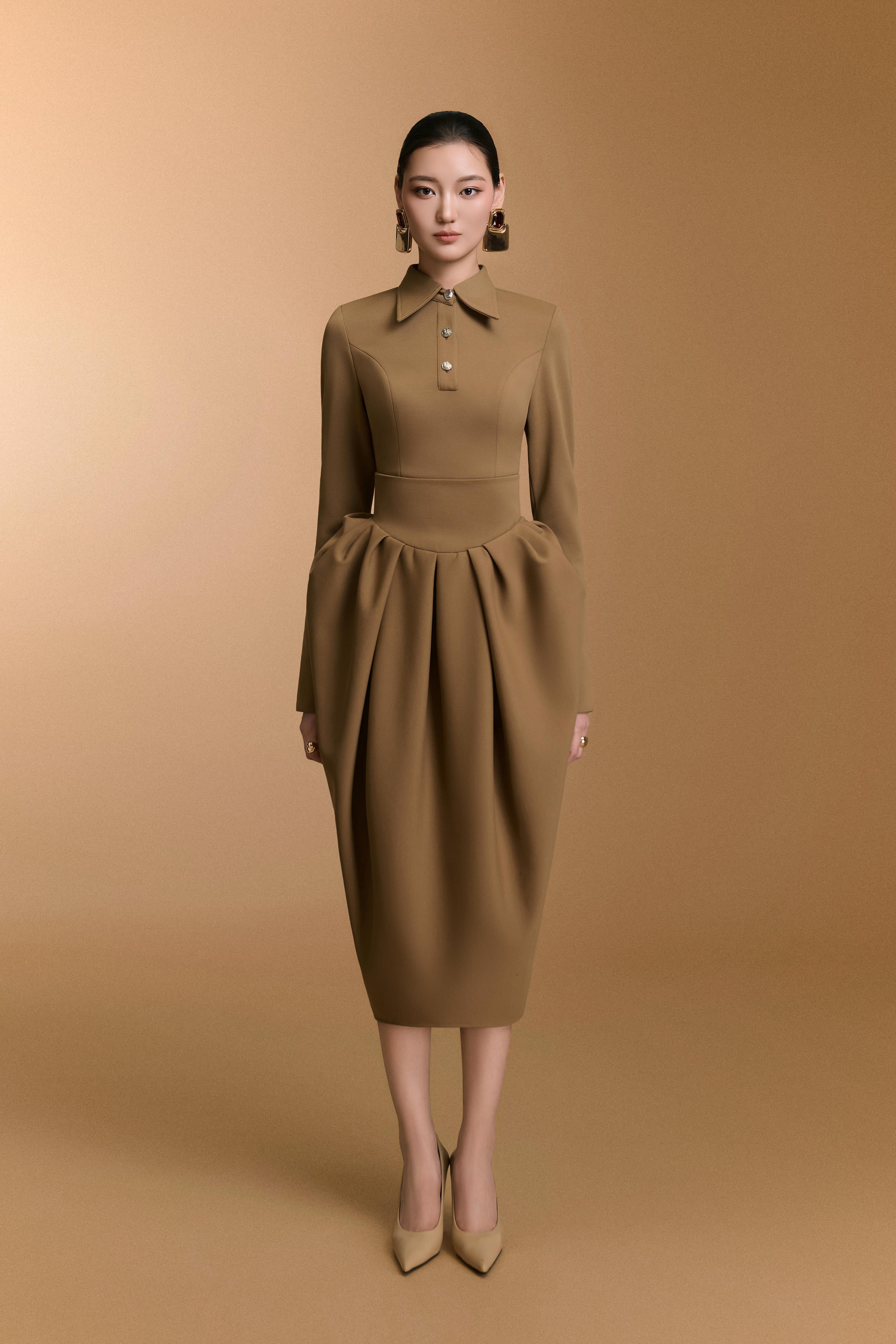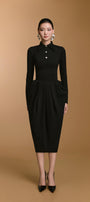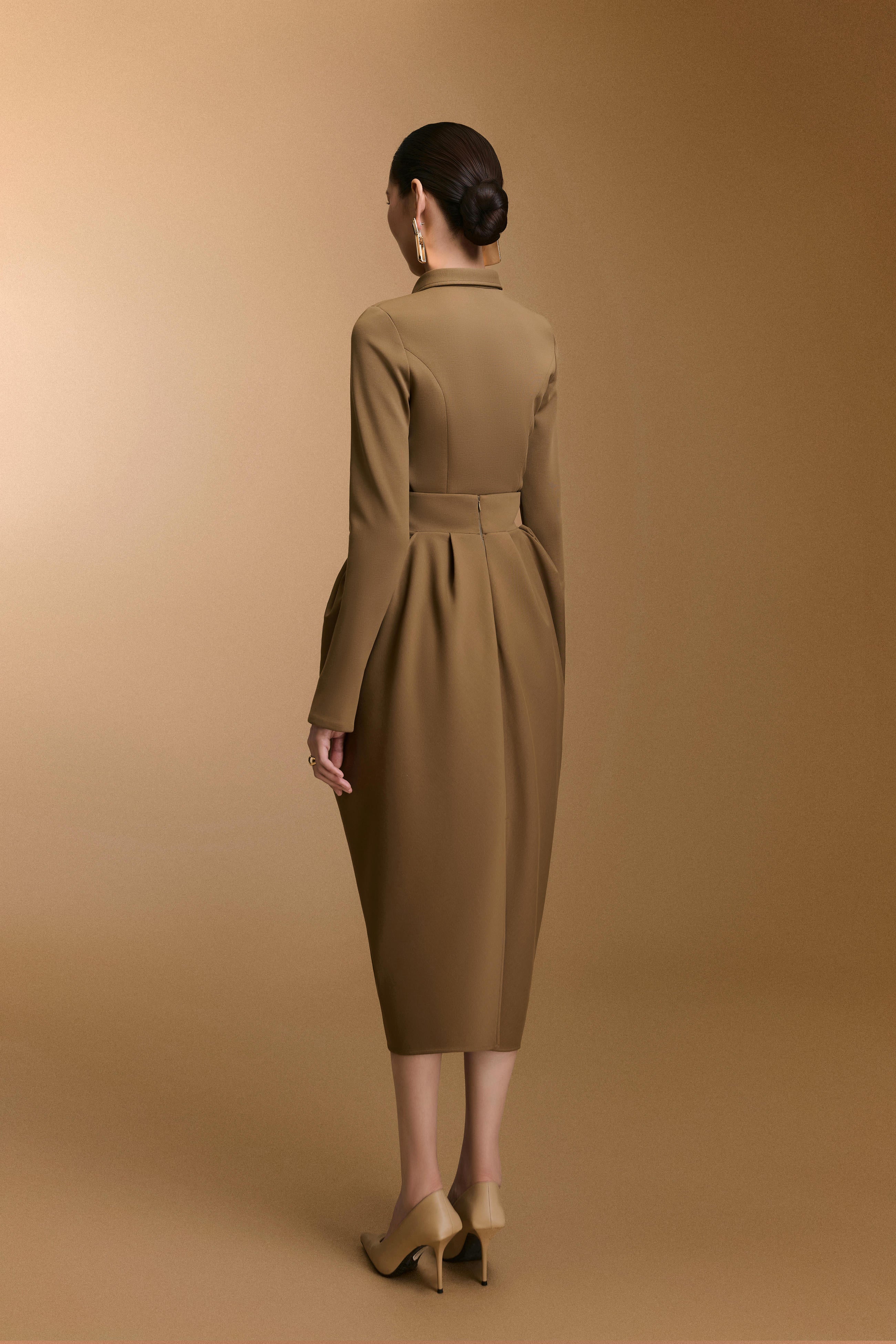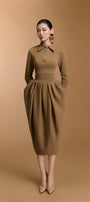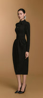 تنورة عالية الخصر بتفاصيل كشكشة عند الورك تُشكّل تصميمًا شبابيًا منتفخًا، تُبرز منحنيات الجسم بقصّة أنيقة. يمزج التصميم بين الأناقة والرقي، ما يجعله مثاليًا لاجتماعات العمل، ولقاءات العملاء، والمناسبات الرسمية.