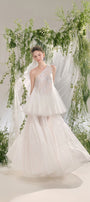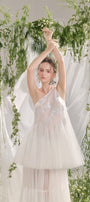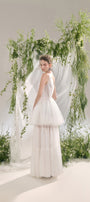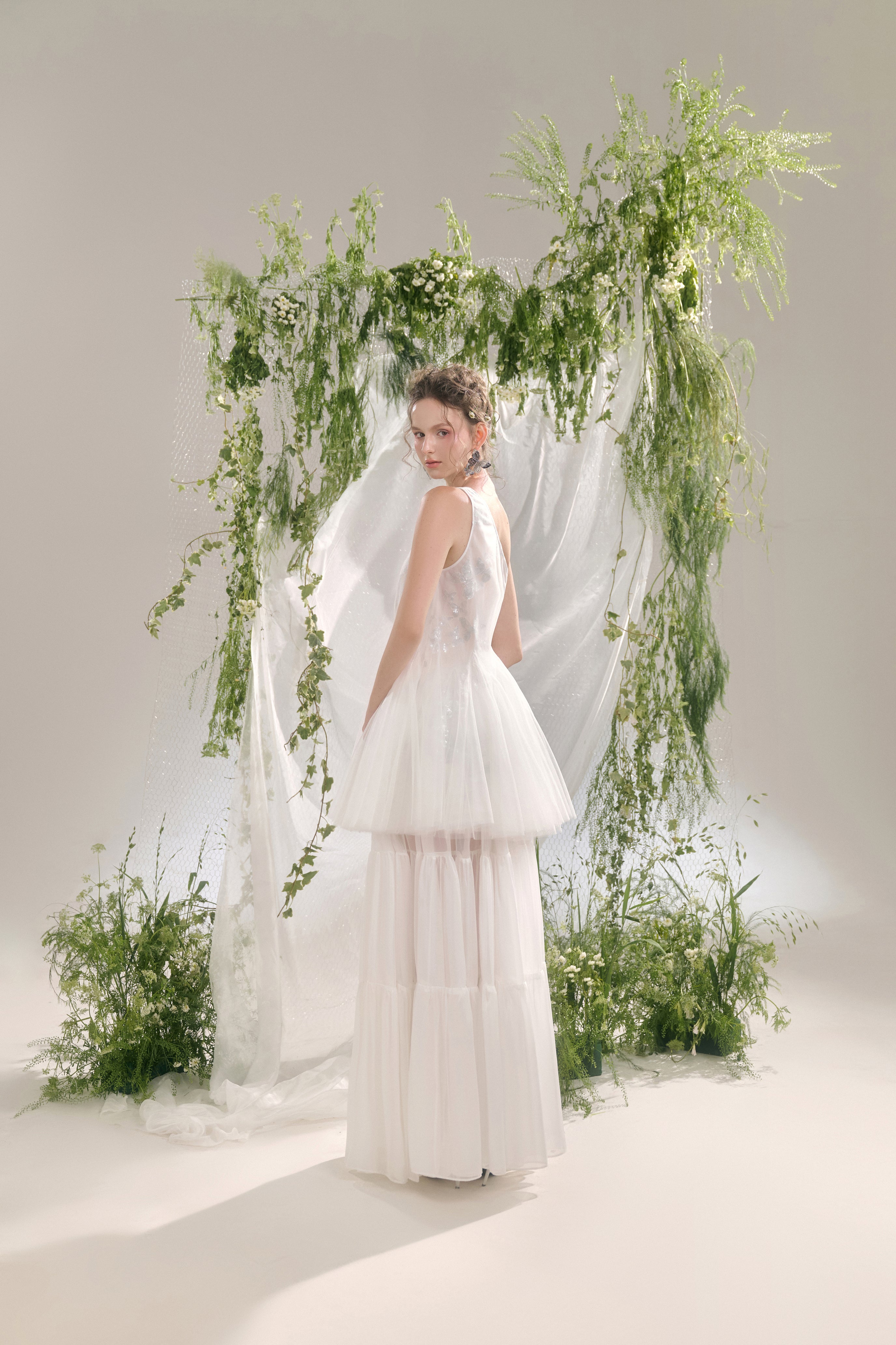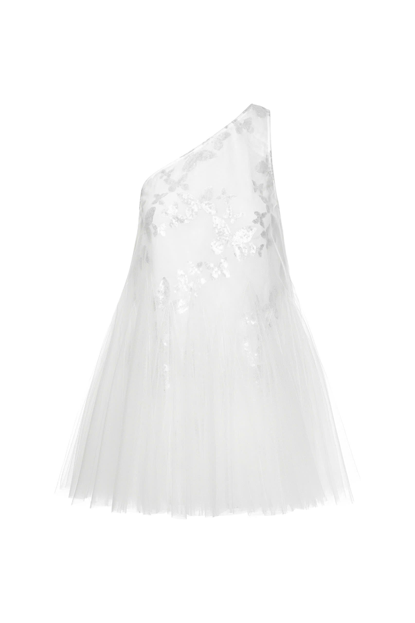 - فستان قصير غير متماثل مزين بدانتيل فراشة فضي لامع، ومغطى بثلاث طبقات من الشبكة المصنوعة من أكثر من 100 قطعة مجمعة للحصول على صورة ظلية ضخمة وخفيفة.