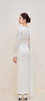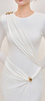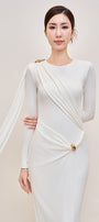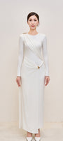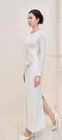 Elegant long jersey dress with refined draping and a delicate back tie detail.