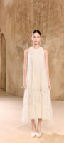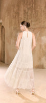 The midi dress combines a A line silhouette with a tiered structure crafted from lace fabric. Its layered design enhances movement and adds depth. The delicate floral lace mix sequined adds a touch of femininity to this dress Expertly tailored, this skirt delivers both elegance and versatility, making it an ideal choice for sophisticated, breathable styling