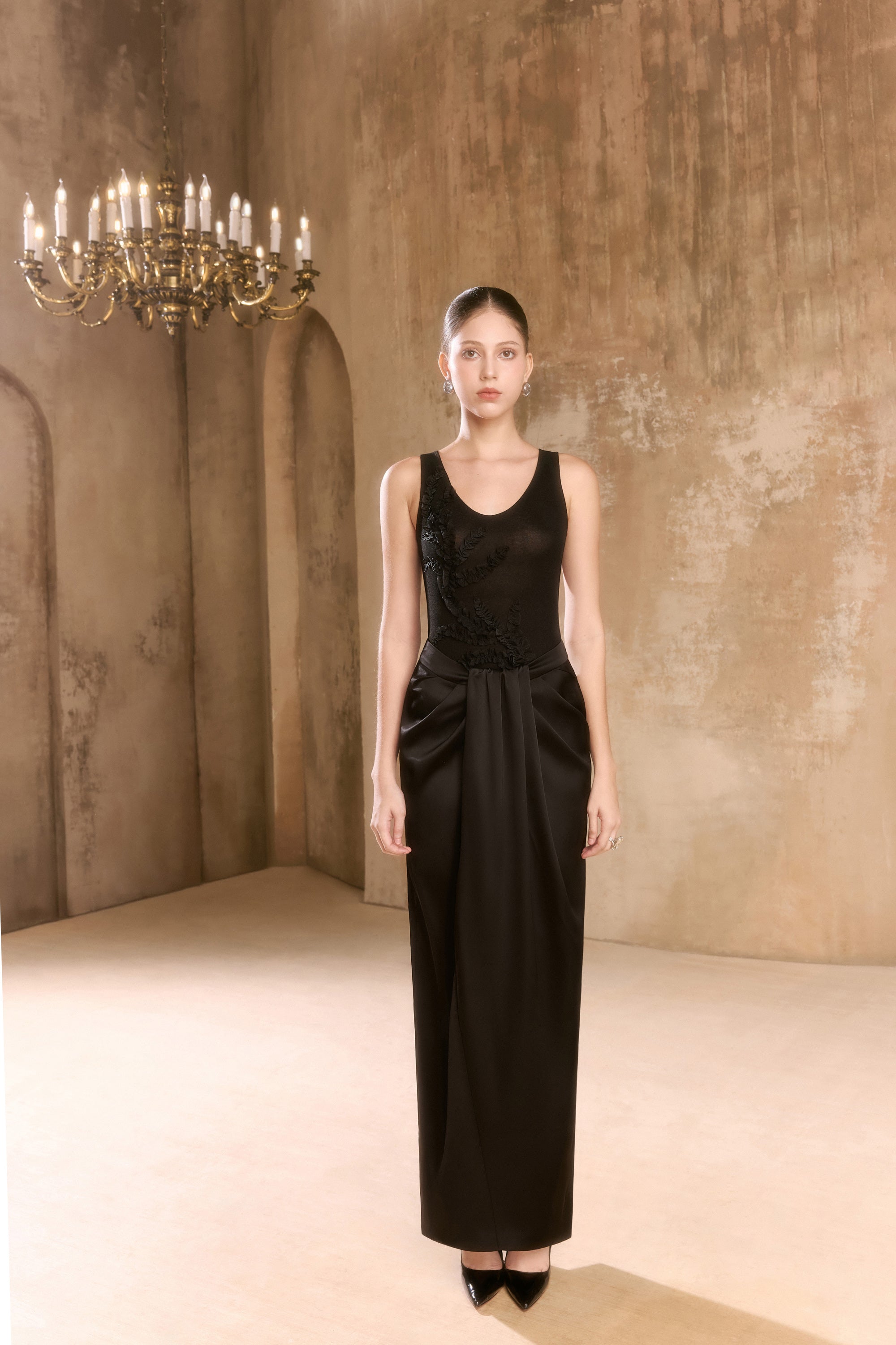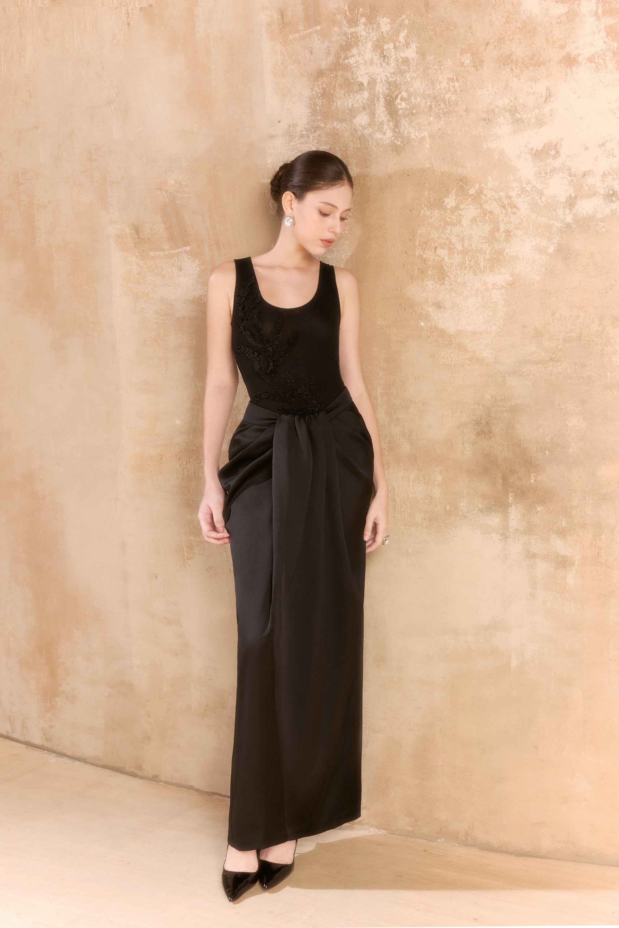 Skirt with sarong design, sophistication. The dress is designed to flatter your figure