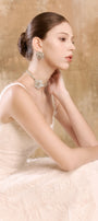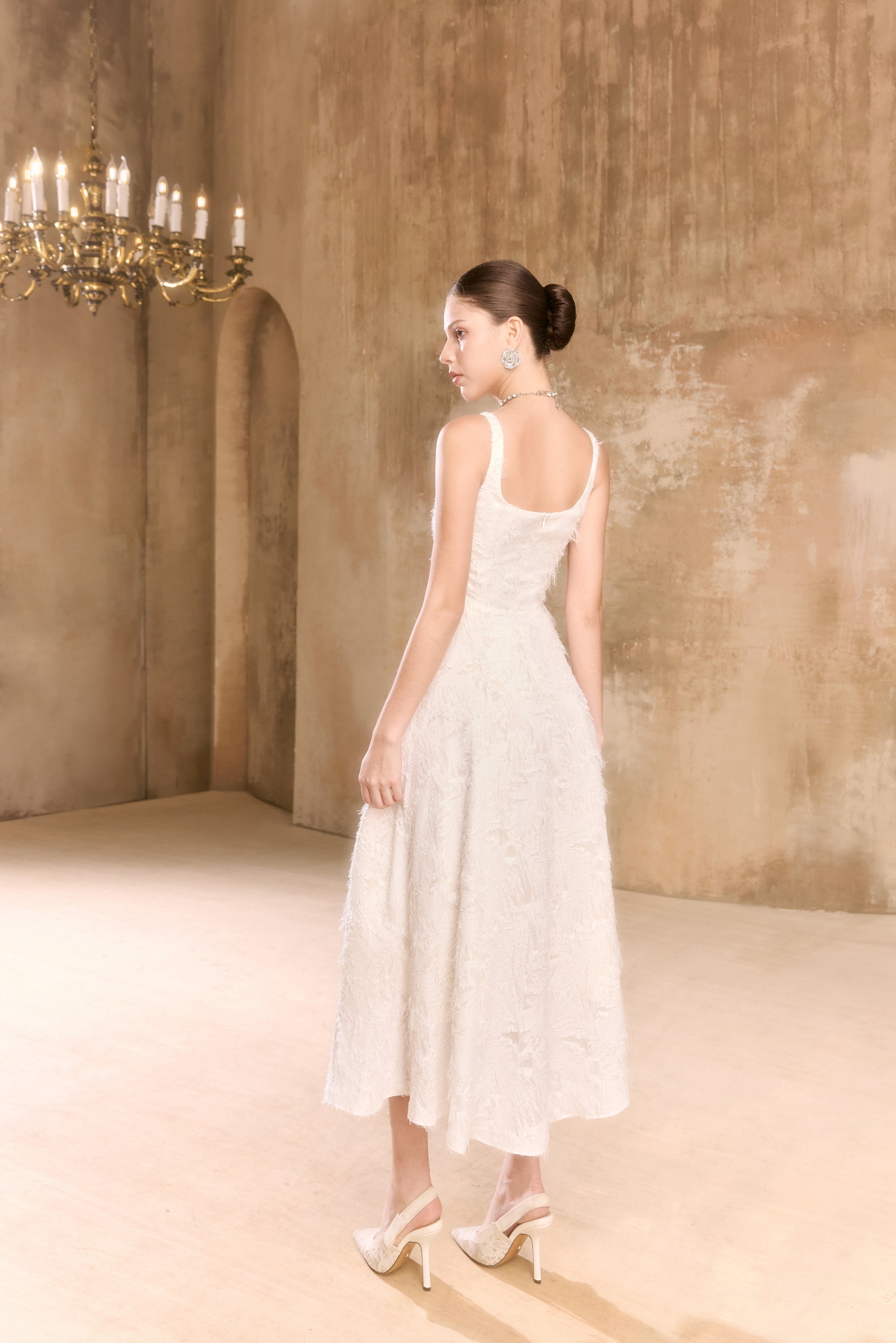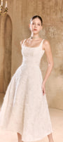 This elegant midi dress features a jacquard fabric that creates a gathered effect. The strappy neckline adds a subtle touch of sophistication while accentuating the shoulders. Perfect for special occasions, this dress offers timeless style with a modern twist.